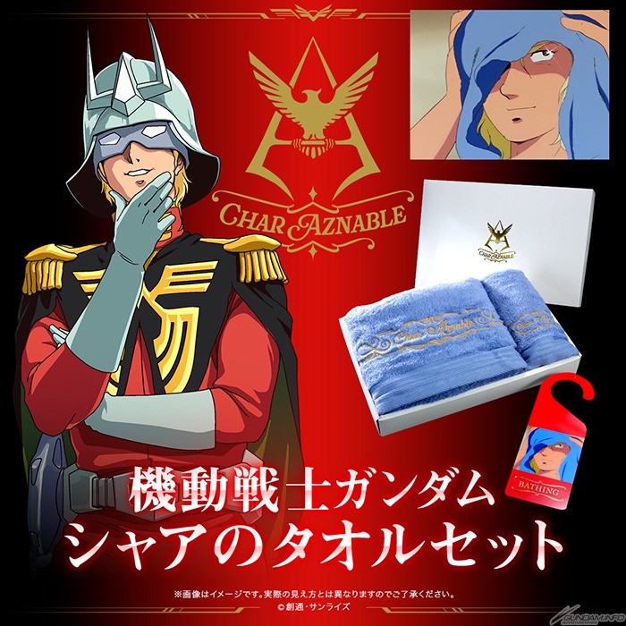 Bandai เปิดตัวสินค้าโดดเด่นที่ ชาร์ อัสนาเบิล ตัวละครเด่นจากเฟรนไชส์กันดั้มไว้วางใจสำหรับดูแลตัวเองตามที่ปรากฎอยู่ในอนิเมะ โมบิลสูทกันดั้ม ตอนที่ 6 กับเซ็ตผ้าเช็ดตัวสีน้ำเงิน ที่ตัวสินค้าจริงถูกระบุว่าเป็นผ้าเช็ดตัวที่ถูกทักทอด้วยเส้นด้ายละเอียดไม่ผ่านการบิด และจะมารอยปักชื่อของชาร์ด้วยด้ายสีทองโดดเด่น